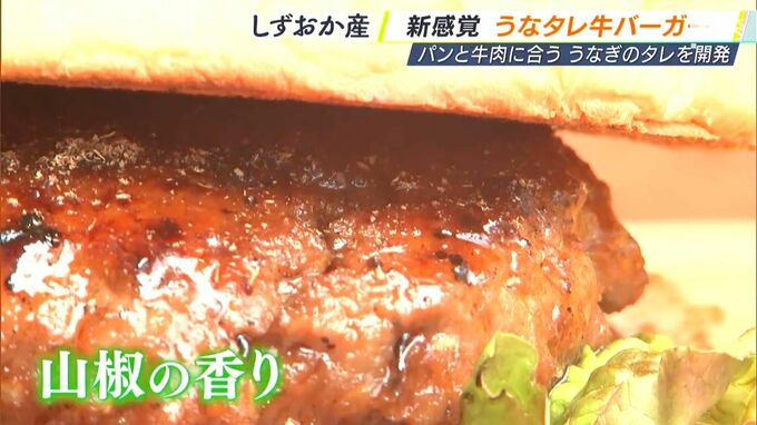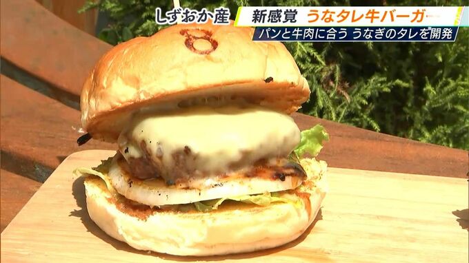 今回のしずおか産は、浜松名物のうなぎのタレを牛肉と組み合わせた新感覚のハンバーガー『うなタレ牛バーガー』です。ウナギのタレがかかった国産の牛肉100%のパティ。