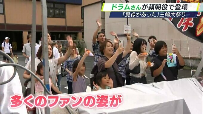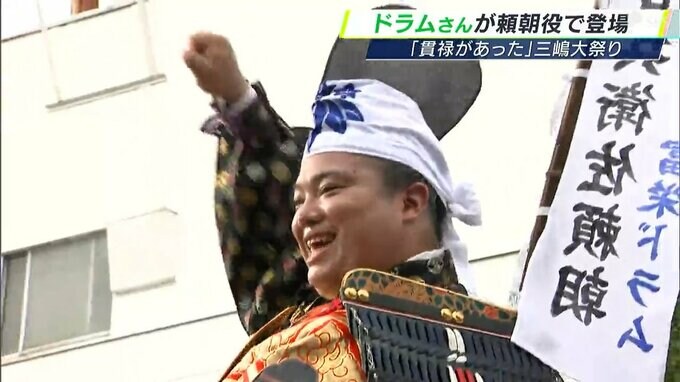 静岡県三島市で開催されている三嶋大祭りには2024年8月16日、俳優の富栄ドラムさんが頼朝役に扮して登場しました。台風の影響が心配されましたがドラムさんを一目見ようと多くの人が沿道に詰めかけました。