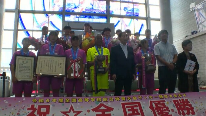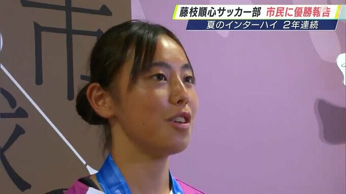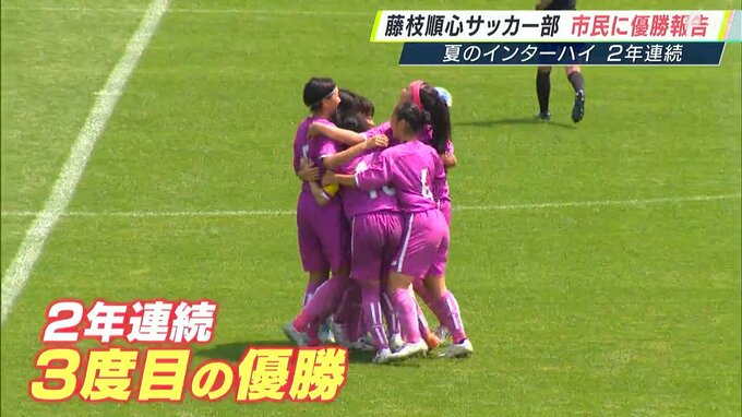 全国高校総体(インターハイ)で2年連続の優勝を果たしたサッカー女子・藤枝順心高校のメンバーが8月23日、静岡県藤枝市役所を訪れ、優勝を報告しました。