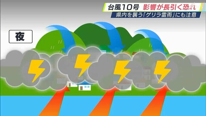 南側に海、北側に山がある静岡県。南から暖かく湿った空気が流れ込んでいるところへ、午後になって山から降りてくる冷たい空気がぶつかり雨雲が発生。発達した積乱雲となり雷を伴った局地的な大雨を降らせるのです。