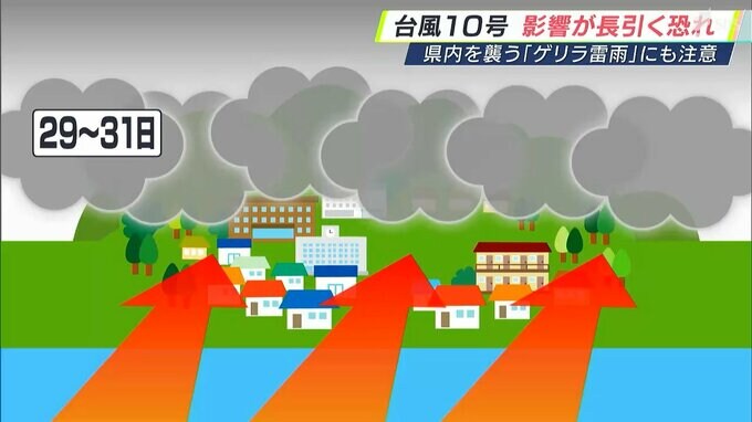 その後、29日から31日にかけては台風の接近に伴い、雨雲を流す南風が強まるため、山地を中心に大雨となる予想です。