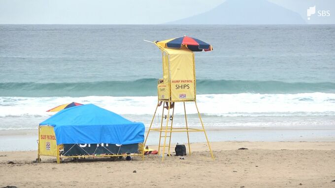 下田市の人気の観光地・白浜大浜海水浴場では、雨が断続的に降り、海水浴客とサーファーはまばらでした。