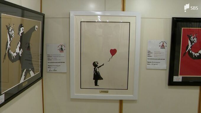 バンクシーは、世界各地の壁や橋などにスプレーで絵を描き、製作中の姿を一切見せない覆面アーティストとして知られています。8月29日から始まった版画展では、バンクシーの作品を長年扱う工房の刻印が押された版画約60点が展示販売されています。