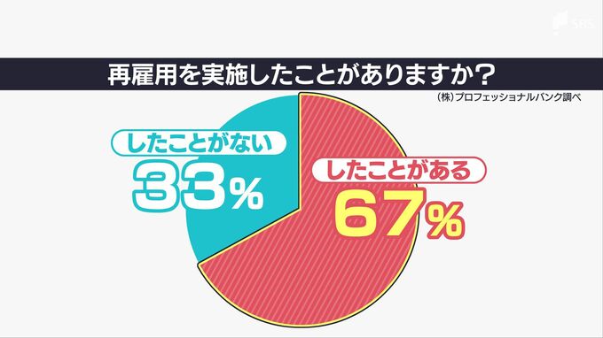 人材紹介サービスを行う都内の会社が、企業の経営者や人事担当者など約300人に行ったアンケートです。再雇用をしたことがあると回答した企業が67%となっていて、多く企業が採用の手法の一つとして利用しています。