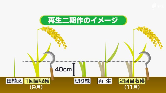 そんな中、暑さを逆手にとって米を育てる農家も現れています。浜松市の田んぼで2024年シーズンから始まったのは「再生二期作」という栽培方法です。稲刈りは根元から切ってしまうのが通常のやり方ですが、再生二期作では株を40センチ程度残して高く刈ります。すると、切株から芽が伸びて2か月ほどで、もう一度収穫できるという栽培方法です。