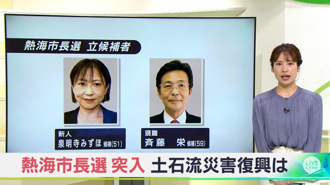 土石流災害からの復興どう向き合うか 熱海市長選は新人と現職の一騎打ち 両候補の主張に有権者はー静岡・熱海市 2022年9月5日(月) 20:44 国内 任期満了に伴う静岡県の熱海市長選が、9月4日告示され、選挙戦に突入しました。立候補しているのは、新人で元熱海市議の泉明寺みずほさんと、5期目を目指す現職の斉藤栄さんです。熱海市政、最大の課題は土石流災…