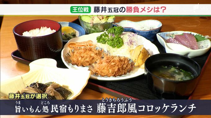 藤井五冠が食べたのは「旨いもん処民宿もりまさ」(牧之原市片浜)の「藤吉郎風コロッケランチ」。牧之原産の玉ねぎをたっぷり使ったクリームコロッケとカツオを海藻で包んだ「め巻き」などがセットになっています。
