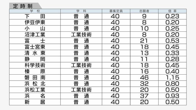【全校全学科掲載】静岡県公立高校入試2025 「確定」志願倍率 静岡1.13倍 浜松北普通1.25倍 磐田南理数1.95倍、韮山理数1.90倍 全体平均は1.06倍 【令和7年度高校入試 変更後出願状況】 2025年2月27日(木) 19:15 国内 【気になる志望校の倍率は?定時制】 ◇下田、伊豆伊東、小山、沼津工、富士、富士宮東、清水東、静岡、科学技術、榛原、磐田南、浜松北、浜松工、浜名、新居