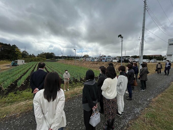 まず、向かったのは御殿場市内のネギ畑。ここで、生産者の「おざわ農園」の代表者から説明を受けます。御殿場でも、耕作放棄農地が増えていて、少しでも地元のためになるようにと、JA職員から農家に転職し、御殿場の冷涼な気候を利用して糖度12度という高糖度のネギの生産にたどり着くまでのストーリーを聞くことができ、農場見学に加えて、食と地域の背景を学ぶことができました。