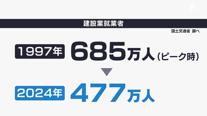 全国的に建設業の就業者は年々減り続けています。1997年の685万人に対し、2024年は477万人となり、高齢化が進んでいるため、次世代の成り手が求められています。