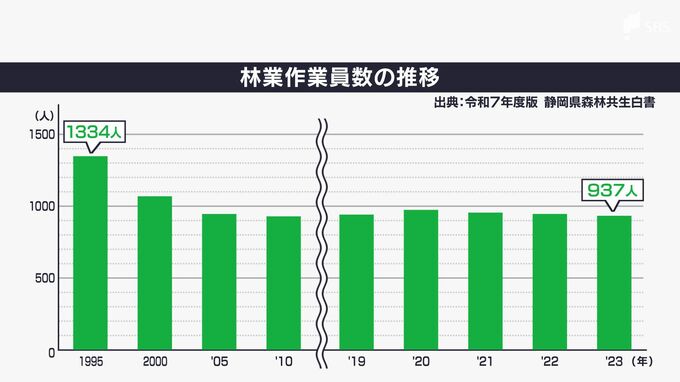 林業でも就業者の確保は課題になっています。県内の林業作業員は、2005年以降900人台を維持していますが、森林を維持・整備していくためにも若手の確保は重要です。