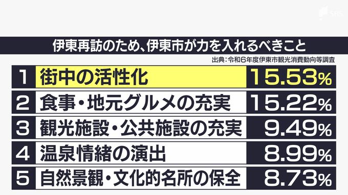 伊東市が観光客を対象に毎年行っているアンケートでは、再び伊東に来てもらうために力を入れるべきことについて、「街中の活性化」が最も高くなっており、市街地の魅力づくりが急務となっていることが分かります。