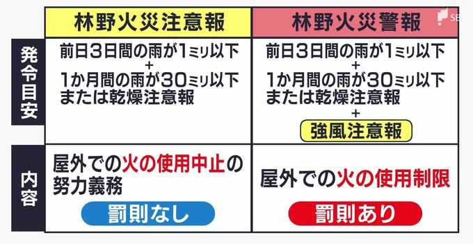 林野火災注意報の発令目安は、前日までの3日間の雨が1ミリ以下であり、1か月間の雨が30ミリ以下、または「乾燥注意報」が出た場合です。さらに「強風注意報」が重なれば、一気に『警報』へと切り替わります。