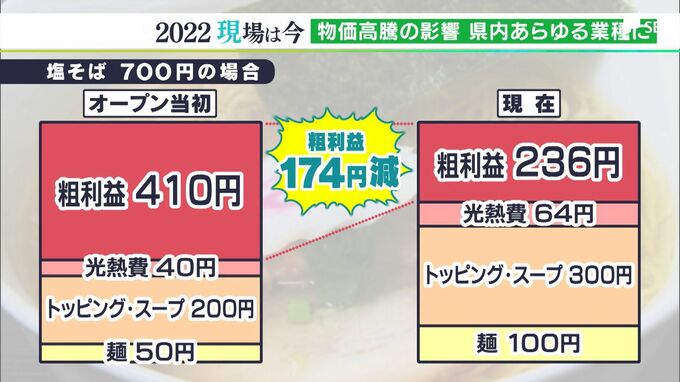 悩みの種は、コロナ禍で沈む飲食業に追い打ちをかけた物価の高騰。ラーメンに欠かせない麺の価格は、1年前と比べると約20%値上がりしています。さらに値段が上がったものも…。