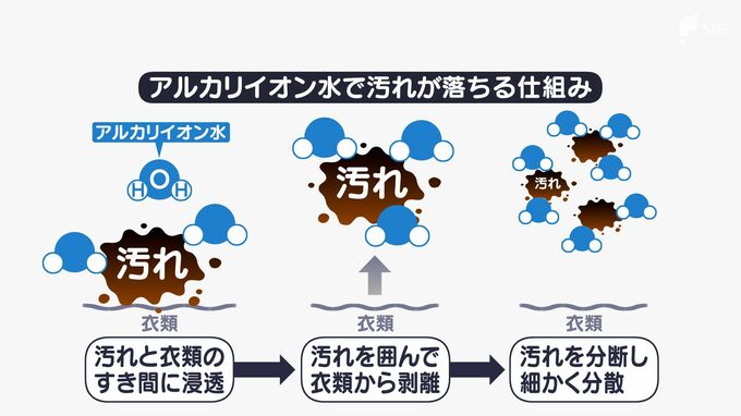「アルカリイオン水自体に汚れと混ざり合い、はがす力がありますので、それによって、汚れをしっかりと落とすことができる」