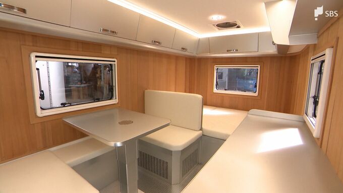 「こちらが一般的なキャンピング仕様です。中に入っていただくと、対面式のソファーテーブル、奥にクイーンサイズのベッド、キッチンカウンターがあって、こちらはサニタリールームという風にしていて、シャワー室やトイレに使えるようになっています」