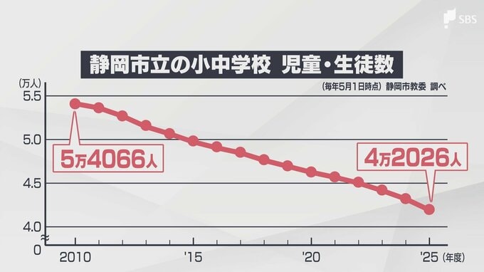 静岡市立の小中学校の児童・生徒数の推移です。▼2010年には、5万4000人あまりいましたが、▼2025年は4万2000人ほどとなり、ここ15年間で1万人以上減りました。