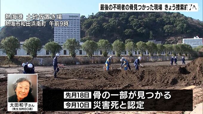 SBS NEWS DIG×熱海土石流 熱海港の土砂仮置き場の捜索 2月20日終了の見通し 最後の不明者の骨の一部発見受け=静岡・熱海土石流災害の捜索 2023年2月20日(月) 12:07 国内 2021年7月、静岡県熱海市で起きた熱海土石流災害で、2023年1月18日に行方不明だった太田和子さんの骨の一部が見つかった熱海港の土砂仮置き場で、警察は2月20日、捜索活動を行なっています。捜索が必要な土砂は残…
