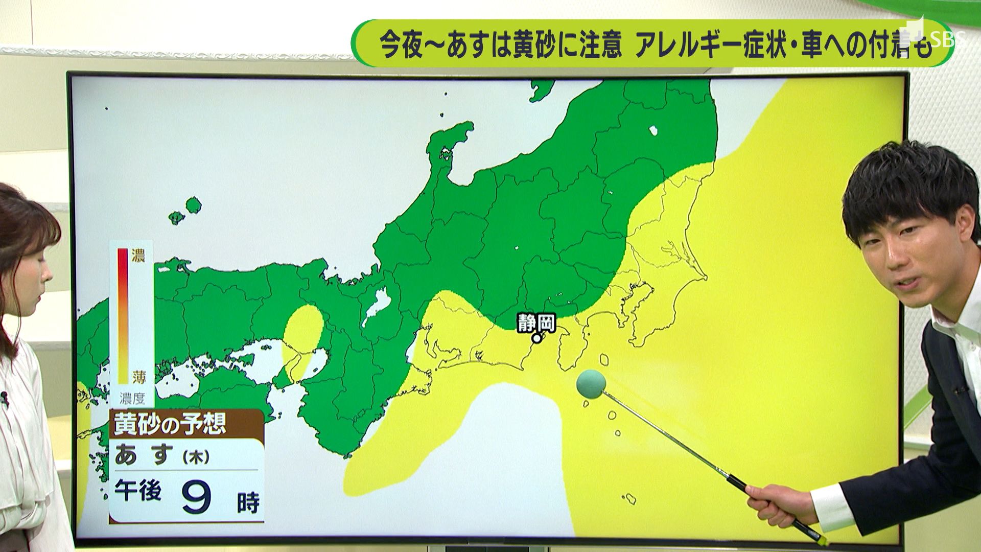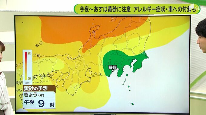 12日の夜9時頃、西から黄砂が入り込んでくる予想になっています。濃度が高いのは北陸や北日本で、静岡県は薄い見込みですが、13日には県内全域を黄砂が覆ってしまい、13日夜遅くまで黄砂が飛ぶ予想となっていて、14日午前中には落ち着く見込みですが、日曜日にも飛来の可能性が出てきています。