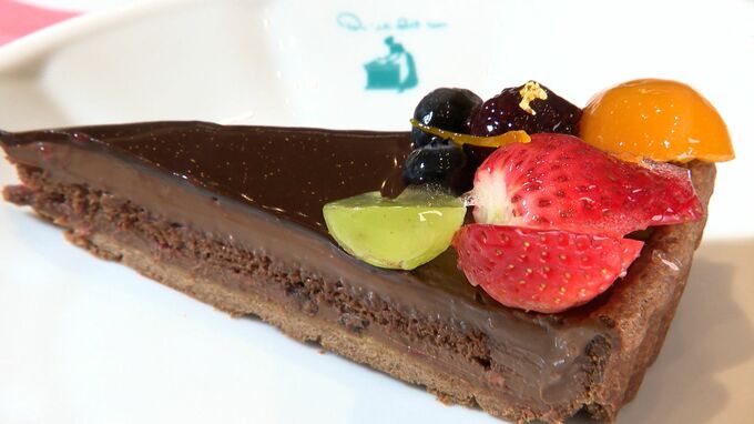 徳川家康にちなんだ「キル フェ ボン」(静岡市葵区)のタルトは、周りを囲む6種類のフルーツで家臣を、チョコレートと金箔で家康公の甲冑を表現しています。