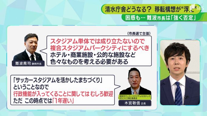 老朽化が進む静岡市役所清水庁舎。この建物をめぐってはもともとJR清水駅東口に移転する計画でしたが、有識者による審議などを経て今の庁舎を改修する方向でまとまりました。今回、報じられた構想は、この建物をサッカースタジアム予定地近くに新築しようという案でした。4月、就任したばかりの難波市長も、まずは現地改修の案で進めると強調しています。