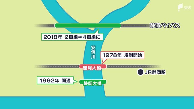 1992年に静岡大橋が開通。さらに、2018年には、国道1号静清バイパスが全線4車線化するなど、規制導入時に比べて道路の選択肢が増えたことで交通量は分散。駿河大橋の交通量はピーク時の1985年と比べると4割ほど減少しました。