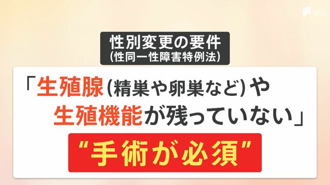 今の法律で戸籍の性別を変えるには生殖腺(精巣や卵巣など)や生殖機能が残っていないことが要件の一つで、手術を受けることが事実上、必須になっています。