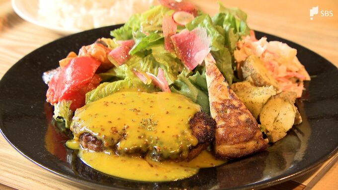 肉汁たっぷりのハンバーグ。匠宿のカフェ、HACHI&MITSUです。丸子産のはちみつを使った料理、そして、パンケーキなどのスイーツのほか、丸子紅茶の香り豊かなフルーティーなドリンクが楽しめます。