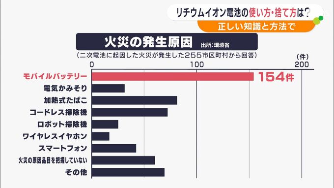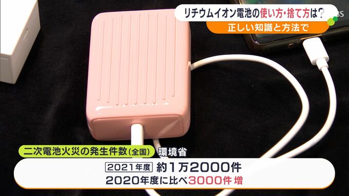 環境省によりますと、リチウムイオン電池の発火などによる全国の火災発生件数は、2020年度に比べ3,000件増え、約1万2,000件に上ります。火災発生の原因は、モバイルバッテリーが6割と最多となっていて、このほか、コードレス掃除機やスマートフォンでも確認されています。