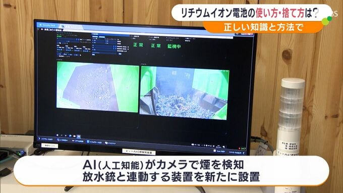 静岡市内の不燃粗大ゴミが年間約1万トン運び込まれる沼上清掃工場(静岡市葵区)でも、2019年3月にリチウムイオン電池が原因の火災が発生。そこで2020年、AI(人工知能)がカメラで煙を検知し、放水銃と連動する装置を新たに設置しました。