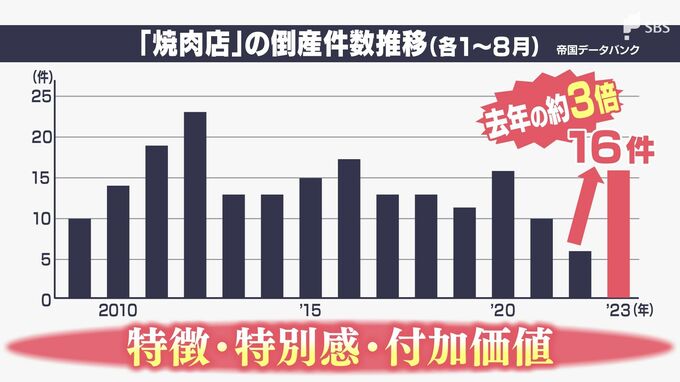 帝国データバンクによると、2023年8月までに焼き肉店が全国で16件倒産しています。この数は2020年のコロナ禍と同じ件数で2022年に比べるとおよそ3倍。相次ぐ物価高によりコストが増し、価格競争に耐えきれなくなるケースです。