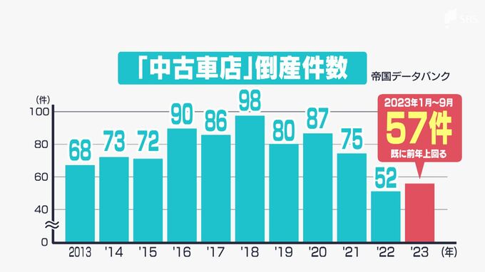 一方、中古車市場は厳しい状況に直面しています。帝国データバンクによりますと、中古車販売店が倒産した件数は、2023年9月までに57件に上っていて、2022年の52件をすでに上回っています。