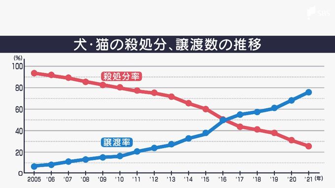 犬と猫の殺処分と譲渡・返却の推移を現したグラフをみると、近年は保護犬への理解も高まり、犬の命を守ろうという人が増えていることが分かります。