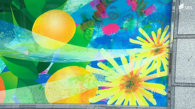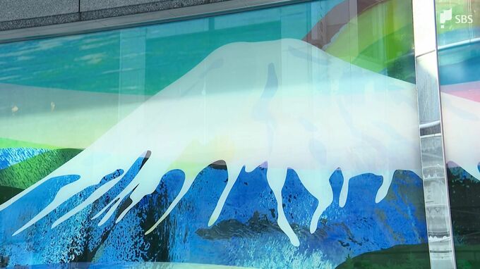 富士山やミカンなどが明るい色合いで描かれているこの作品は、障がい者支援施設に通う人たちが描いたものをプロのデザイナーが再構築して完成させました。