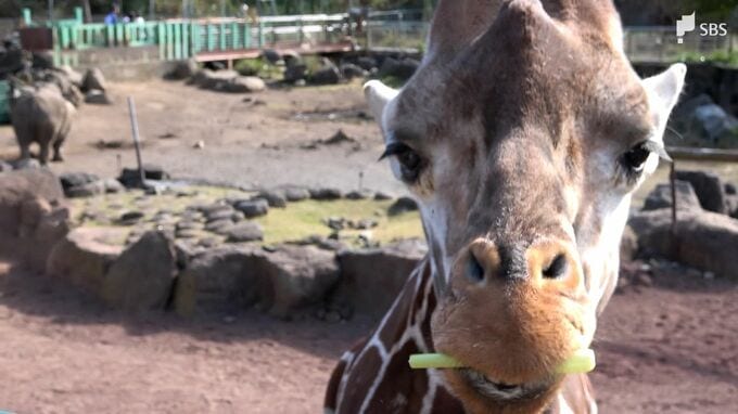 小松菜をおいしそうにほおばる3歳の雌のキリン「クルミ」。一般公開が始まりました。