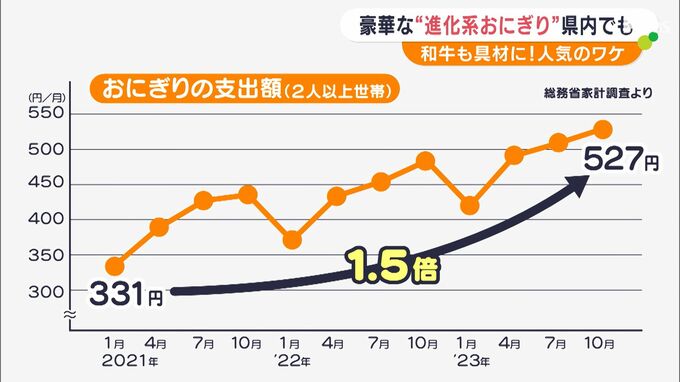 2人以上の世帯が1か月あたり「おにぎり」に使う金額は近年、右肩上がりで、2023年10月の実績は、2年前の1月に比べ約1.5倍に。おにぎりブームを裏付けるデータといえます。