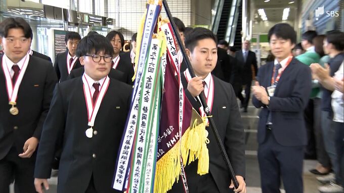 静岡市役所で開かれた合同の壮行会には、静岡学園高校サッカー部と静岡聖光学院高校ラグビー部の選手たちが参加しました。