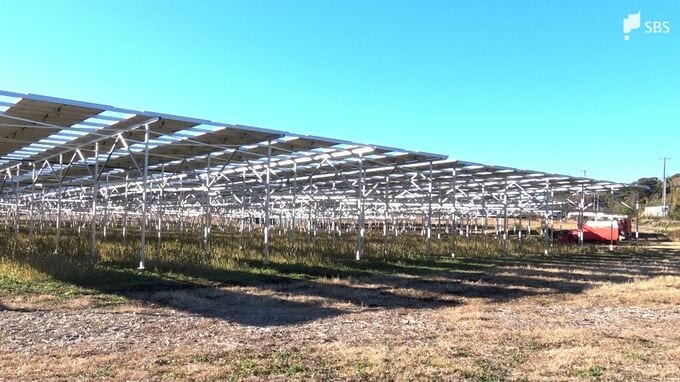 「太陽光パネルの下をコンバインが走っています」