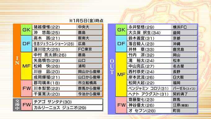 2023シーズンまでキャプテンを務めた鈴木義宜選手などが移籍。さらにFWチアゴサンタナ選手とFWカルリーニョス・ジュニオ選手は、契約交渉中ということで去就は不透明です。