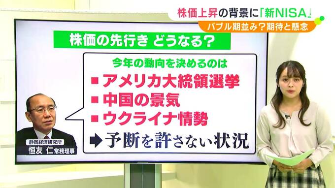 気になるのは今後の先行きです。静岡経済研究所の恒友仁常理事によりますと、秋のアメリカ大統領選や中国の今後の景気、ウクライナの状況変化といった株価に影響する不確定な要素がこの先多く控えているため「予断を許さない状況だ」ということです。