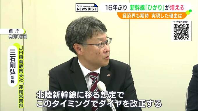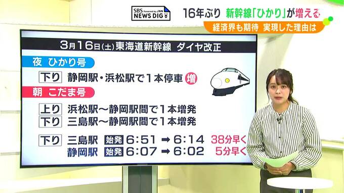 2024年3月、北陸新幹線が福井県の敦賀駅まで東京駅から直接伸び、東海道新幹線の米原駅で乗り換える人が減ることから、ダイヤに余裕が生まれ、その分を静岡に回し「ひかり」を1本増やせたということです。