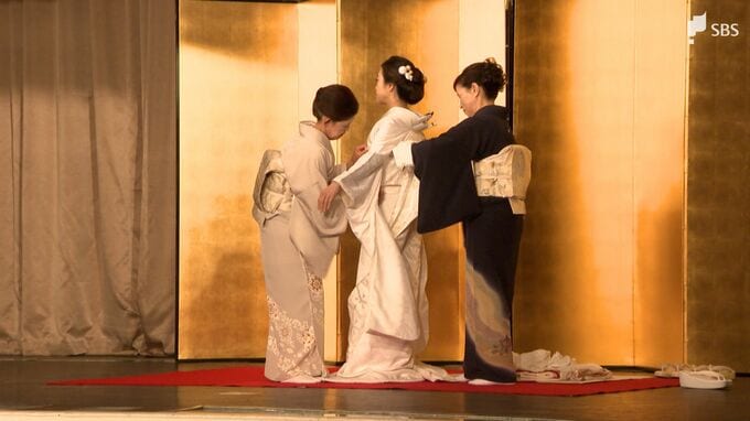 メインイベントは学院の先生による花嫁の白無垢を着付けするデモンストレーションです。会場の生徒たちも先生の手慣れた着付けを写真を撮るなどして学んでいました。