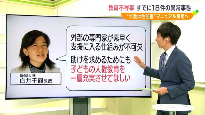 教職員による性加害を防ぐ仕組みについて、県教委に提言を続けてきた静岡大学の白井千晶教授は「外部の専門家が素早く支援に入る仕組みが不可欠。被害や加害を見つけたら助けを求めるためにも、子どもの人権教育を一層充実させてほしい」と話しています。