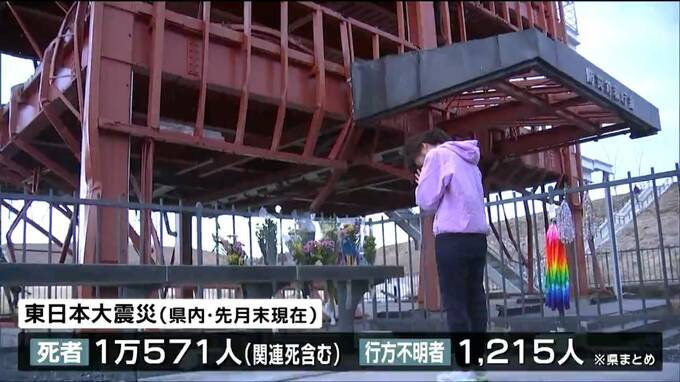県のまとめによりますと、東日本大震災で県内では、2月末現在、関連死を含め1万571人が死亡、1215人が行方不明となっています。