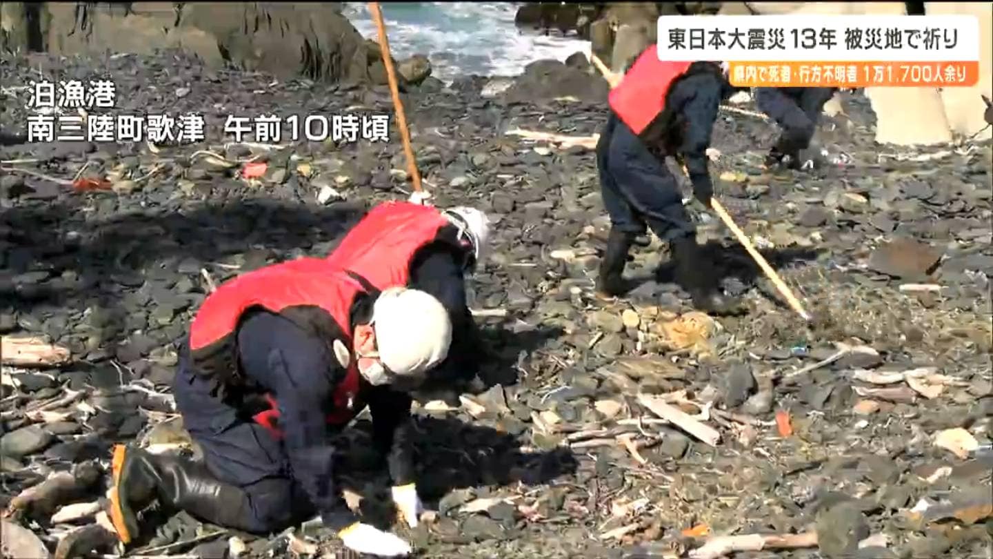 南三陸町歌津にある泊漁港近くの海岸では、警察が震災不明者の捜索を行いました。南三陸町ではいまも211人の行方がわかっていません。