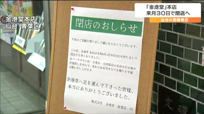 仙台の老舗書店「金港堂」が市中心部にある本店を4月30日で閉店すると発表しました。突然の閉店の知らせに市民からは惜しむ声が上がっています。