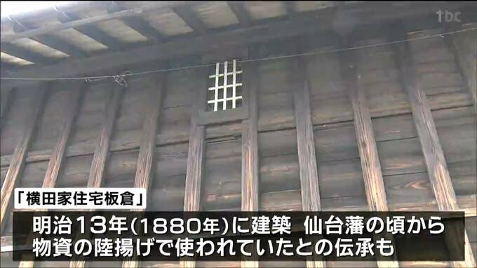 国の文化財に登録されるのは、仙台市宮城野区鶴巻にある「横田家住宅板倉」です。農具や籾を保管する木造の蔵で明治13年=1880年に建築されました。江戸時代、仙台藩の頃から物資の陸揚げで使われていたとの伝承も残っています。