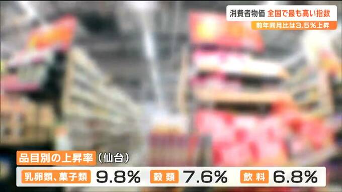 家庭で消費するモノやサービスの値動きをみる仙台市の消費者物価指数は、2月、生鮮食品を除いた指数が全国の都市で最も高くなりました。去年の同じ月よりも3.5%上昇していて、2年8か月連続で上回っています。