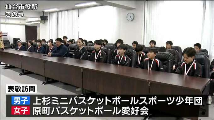 3月28日から行われるミニバスケットボールの全国大会に出場する仙台市内の男女2チームが25日、仙台市役所を訪れ大会での活躍を誓いました。