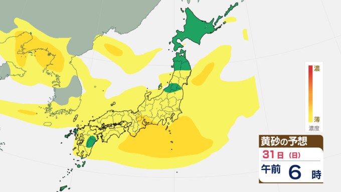 この黄砂が29日の未明には西日本に、29日午後には北日本や東日本の一部にも飛来し始めるとみられています。そして、その後、31日にかけて列島の広い範囲にかかる予想となっています。
